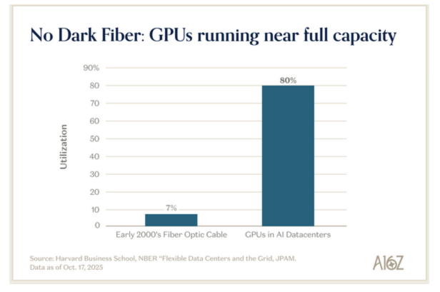 Unlike telecom during the dot-com era, where less than 10% of capacity was used after buildout, AI compute capacity is consumed rapidly once available. [8] The critical shortage today is GPUs and AI accelerators, not unused capacity.