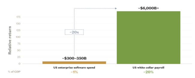The labor replacement market for AI is massive. Lightspeed estimates that this market will be a $19.9T market by 2030. Regardless of who’s estimate you trust, it’s undeniable that this market is significantly larger than enterprise software.